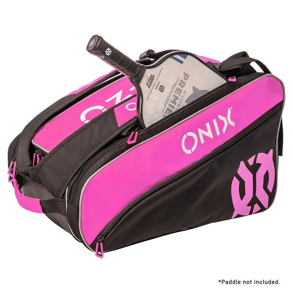 Join the fight for breast cancer awareness with the Onix Pro Team Pickleball Paddle Bag Pink and Black. Its main compartment is perfect for storing a change of clothes and other things you may bring to the court. Dedicated side paddle compartments ensure you can keep your paddles safe from wear and tear wherever you go. Outside the paddle compartments are outer pockets you can use to store small accessories. A dedicated shoe compartment at the bottom helps you store a change of shoes without getting the rest of your equipment dirty. With padded shoulder straps and a nylon carry handle, carrying your gear around will be much easier.