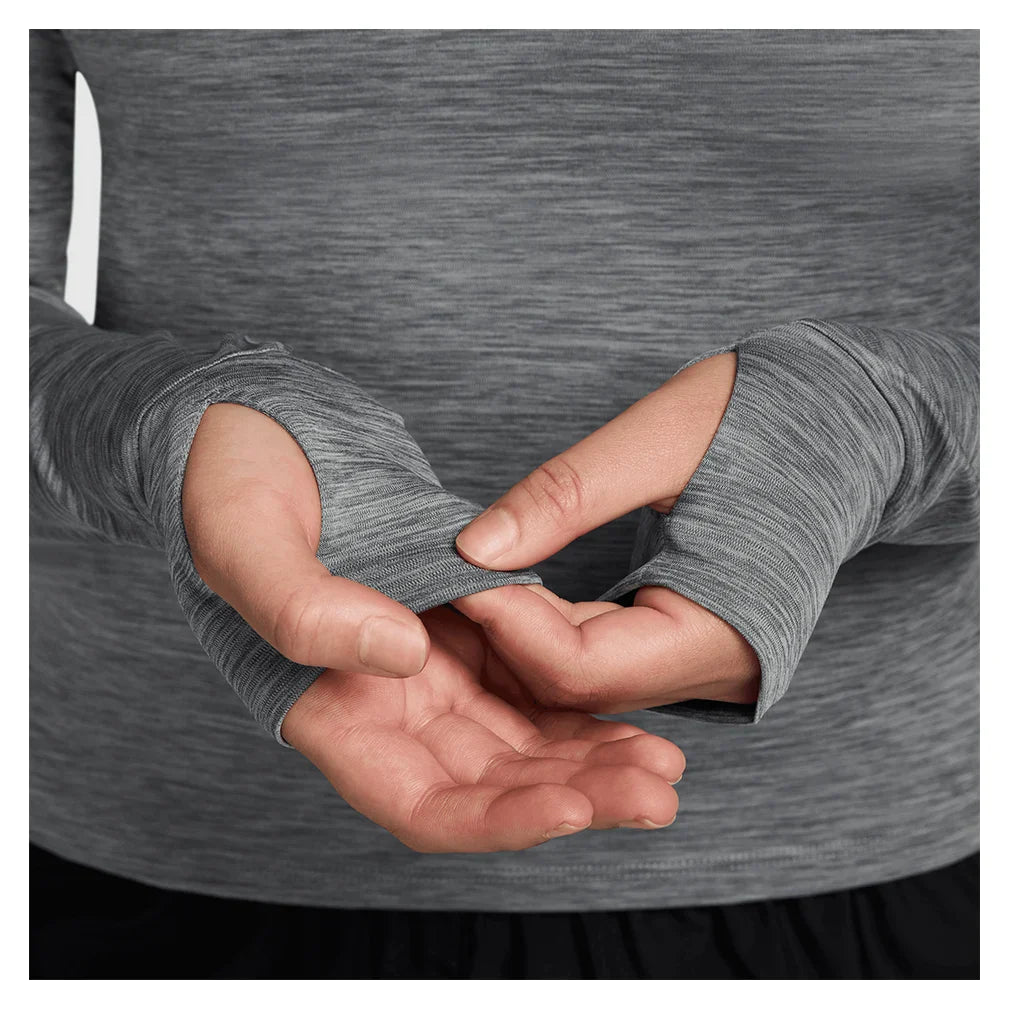 The Nike Women`s Pro Dri-FIT Long-Sleeve Training Top delivers compression-like support with a fitted design that moves as one with your body during high-intensity training or court drills. Thumbholes anchor the sleeves in place through overhead serves and full-extension shots, preventing fabric from sliding up your arms mid-movement. The polyester-spandex blend provides four-way stretch for unrestricted mobility while Dri-FIT technology pulls sweat away from your skin to keep you focused on performance. Strategic mesh panels under the arms create targeted ventilation zones right where heat builds up most during intense rallies or fitness sessions. Lightweight yet durable, this smooth fabric resists snags from equipment or court surfaces while maintaining its shape wash after wash. Perfect as a base layer for cool mornings or standalone for heated matches, this versatile top works seamlessly with your entire athletic wardrobe.